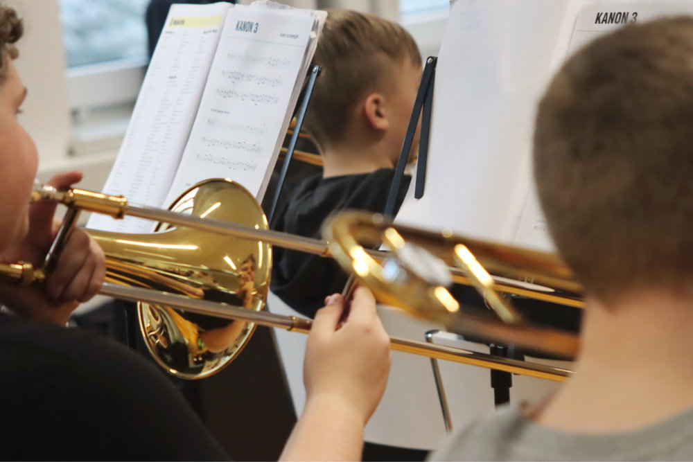 Die gesamte Klasse bildet ein Blasorchester. Beim gemeinsamen Musizieren kommt es darauf an, aufeinander Rücksicht zu nehmen und harmonisch zusammenzuarbeiten. Das stärkt den Klassenzusammenhalt ungemein.